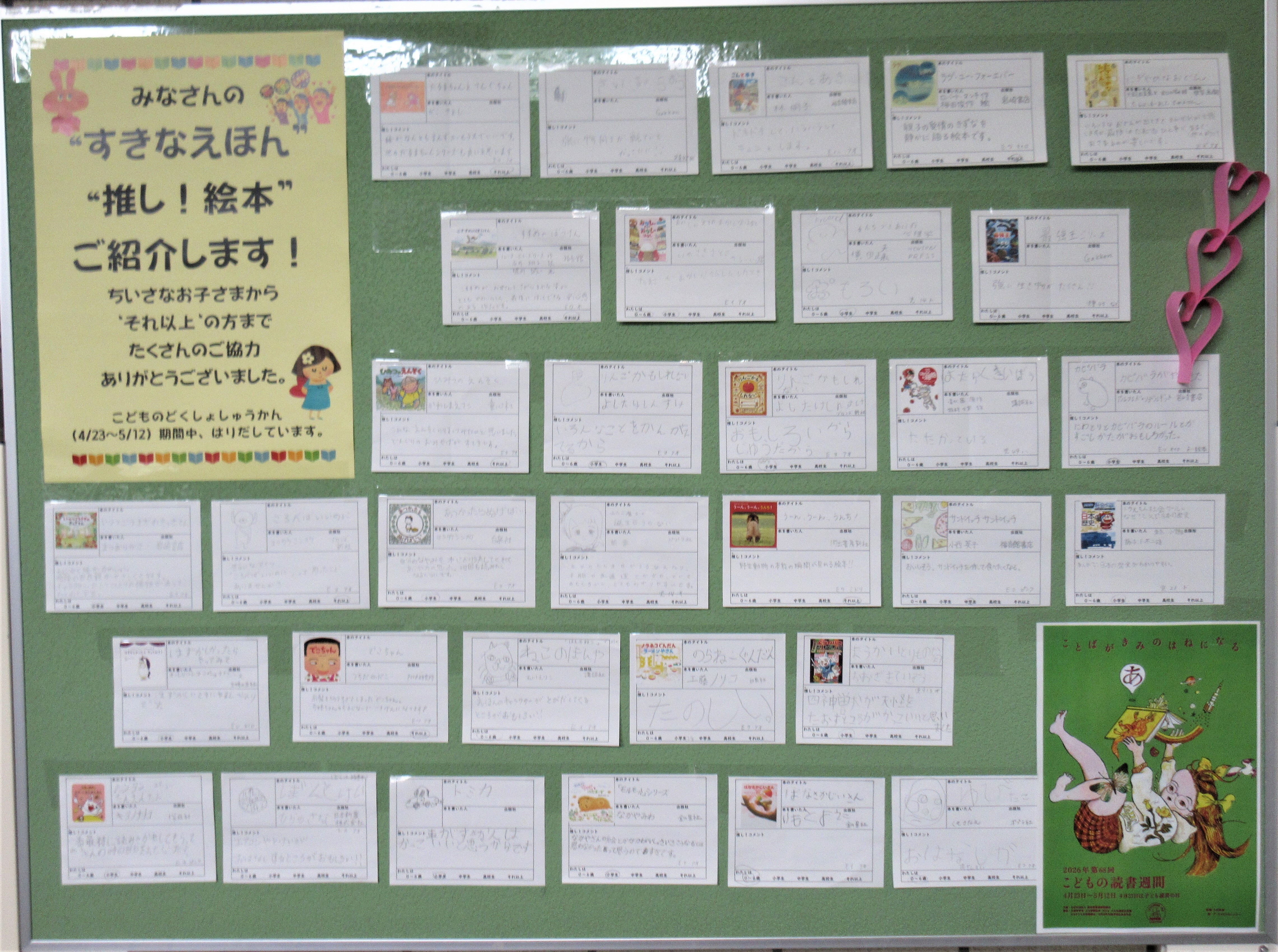「こどもの読書週間」(4月23日~5月12日)に合わせ、みなさんの『すきなえほん』『推し絵本』を掲示しています。