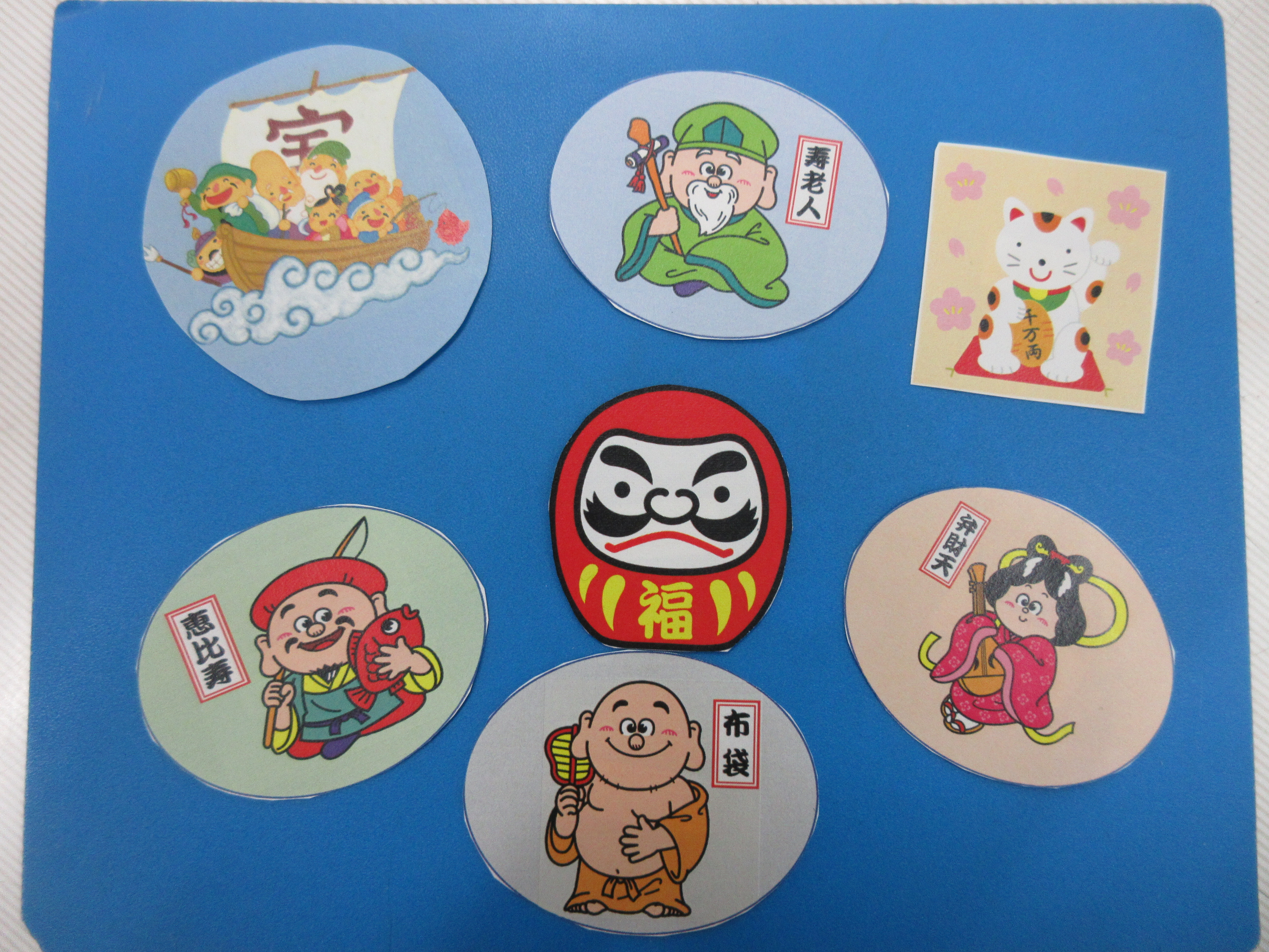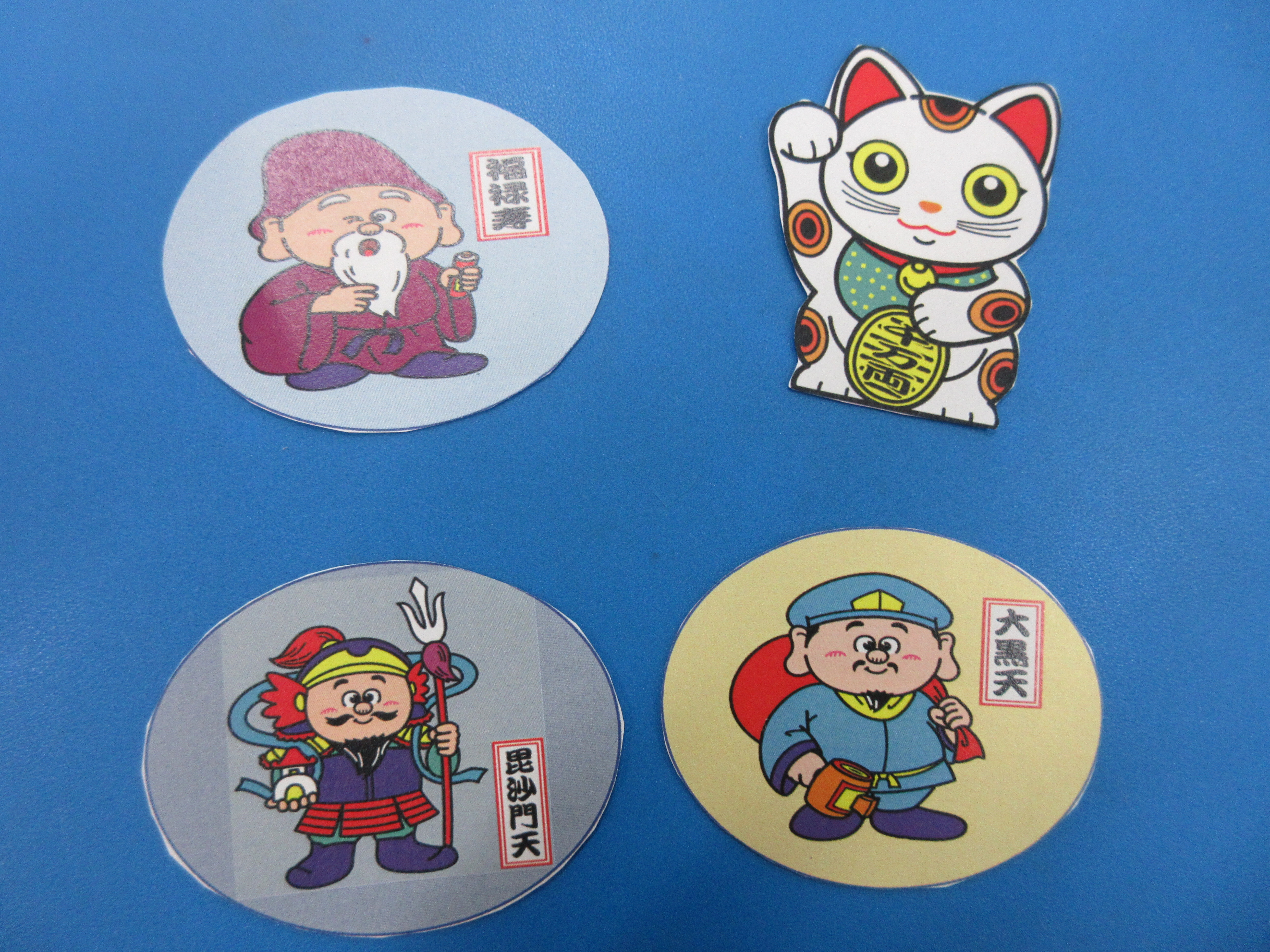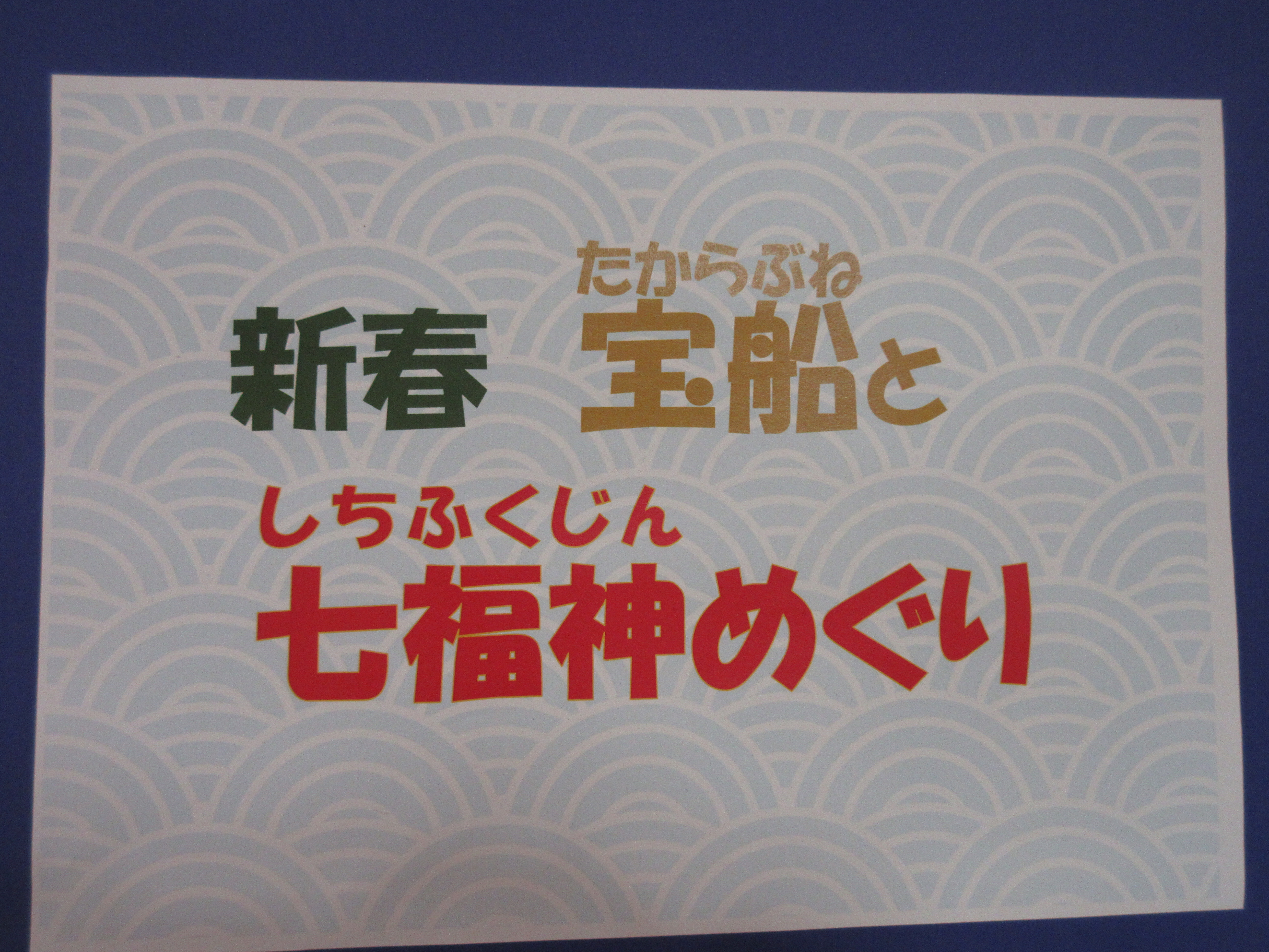 お正月になると各地で「七福神めぐり」が話題になります。七福神とは「恵比寿天(えびすてん)・大黒天(だいこくてん)・毘沙門天(びしゃもんてん)・弁財天(べんざいてん)・福禄寿(ふくろくじゅ)・寿老人(じゅろうじん)・布袋尊(ほていそん)」というインドや中国が由来の七柱の神様の総称で、日本の神様は恵比寿天だけなのだそうです。七福神めぐりは、五穀豊穣や金運や厄除け、夫婦円満や延命長寿などそれぞれの神様のご利益を得るために、神様に縁の七つの寺社をお参りする行事のことを云い、江戸時代に庶民の間に広まったのだそうです。年中行われる行事ですが、特に1月7日までに行うと大きな福に恵まれるといわれています。今月は尾島図書館に宝船が現れました!たくさんのお宝や神様を貼って、願い事をしてください。