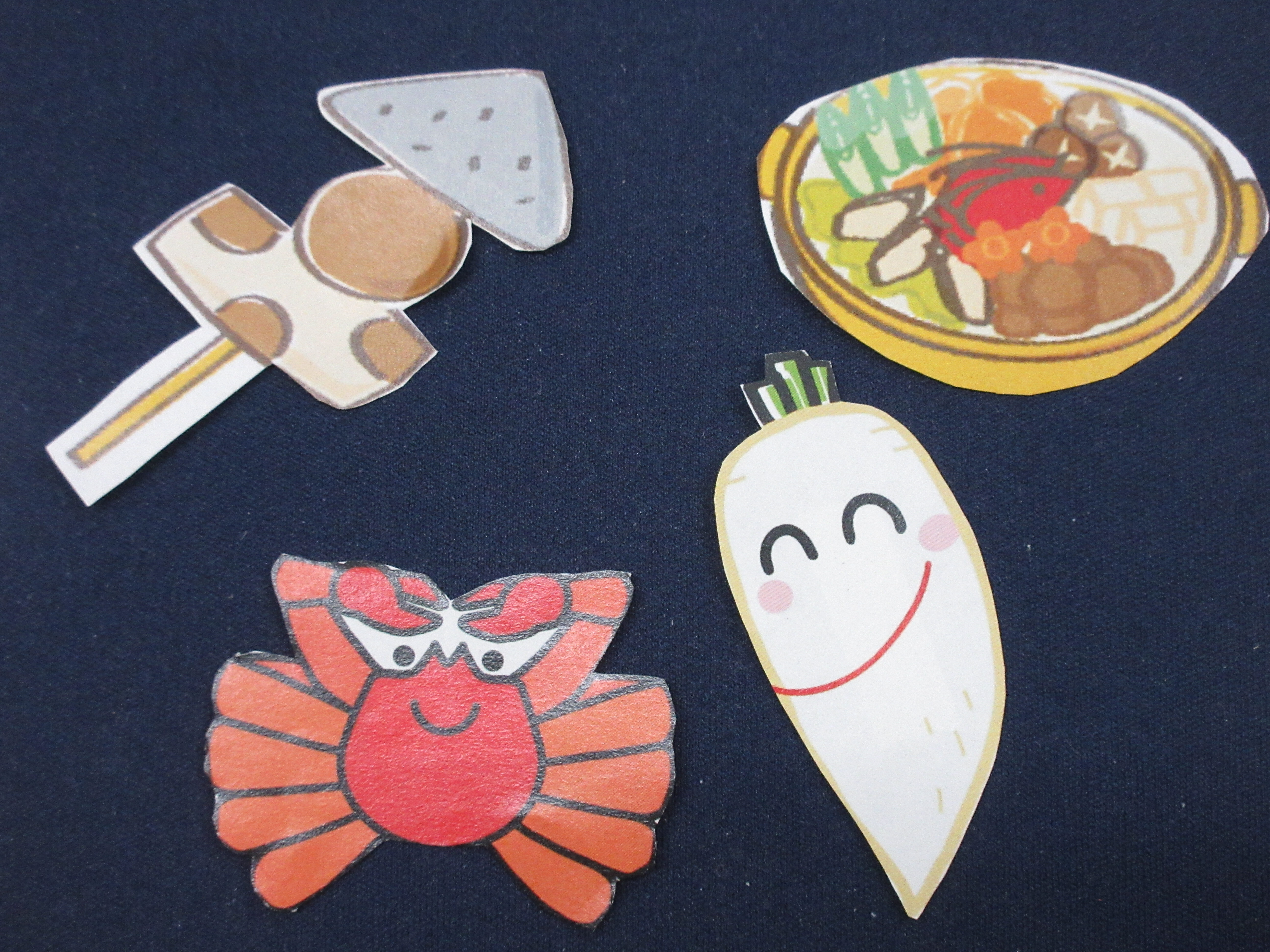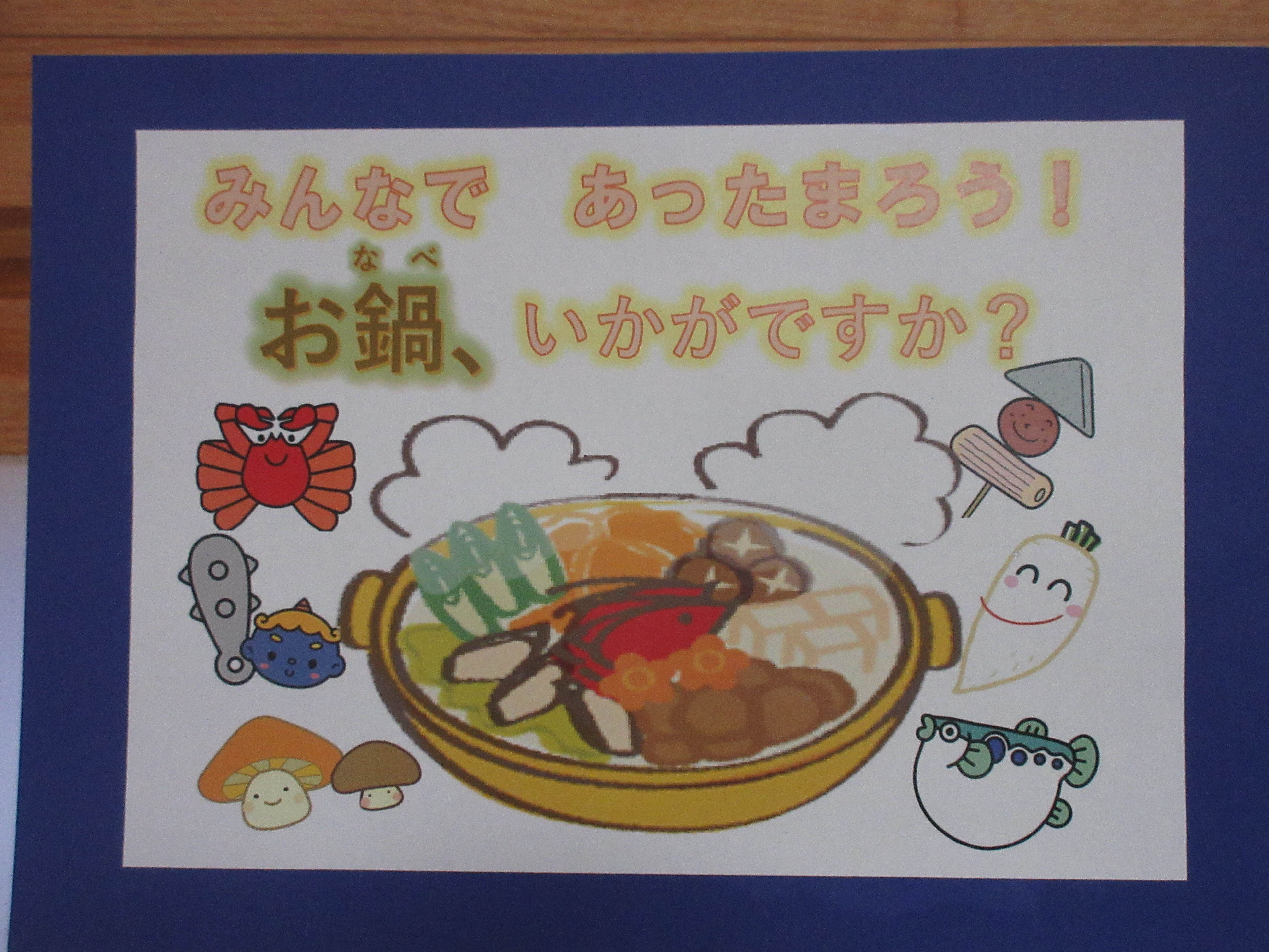 厳しい寒さが続くこの季節、暖かい部屋で皆でお鍋なんて最高ですよね。鍋料理の始まりは、土器が発明された縄文時代だそうです。その頃には食べ物を入れた土器を火にかけて汁物や煮物を作る習慣があったそうですが、今のように「みんなで鍋を囲んで楽しむ」形が普及したのは、江戸時代だそうです。「寄せ鍋」や「ちゃんこ鍋」「牛鍋」や「水炊き」などなど、今や日本で食べられる鍋は百数十種類を数えるとか。韓国料理の「キムチ鍋」や中国の「火鍋」など国際色豊かな鍋を味わうこともできます。ちなみに、日本で「チゲ鍋」というと赤いスープのピリ辛鍋を思い浮かべますが、「チゲ」とは韓国語で鍋料理のことを云い、「チゲ鍋」は「鍋鍋」という意味だそうです。今月は大きな鍋の台紙を用意しました。そこに、ダイコンやキノコ、カニなどのシールを貼って、あったかい鍋を完成させてください!