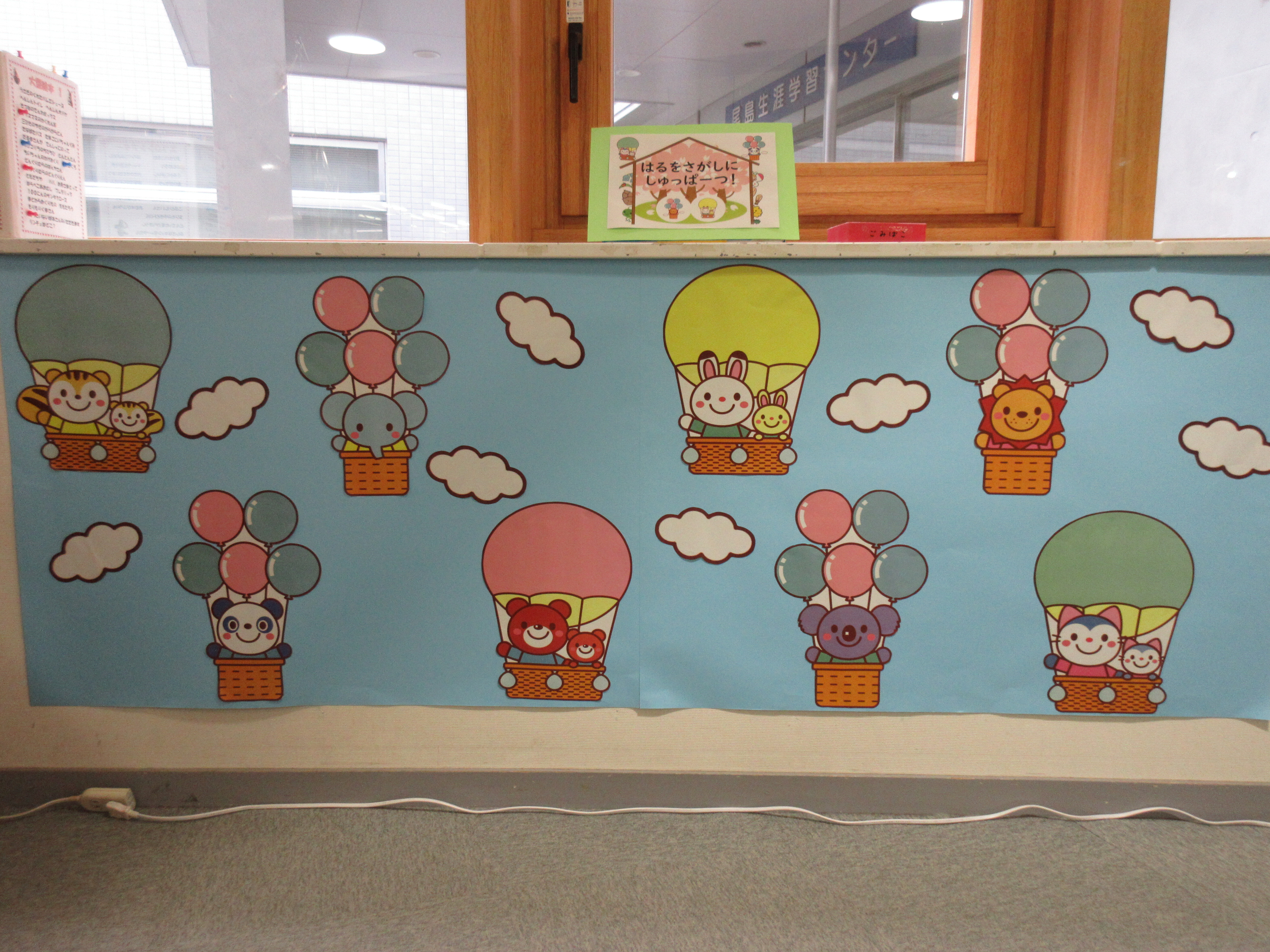 日本の春は、気象学的には3月から5月までをいい、寒さが和らぎさまざまな花が咲き始める生命力にあふれる季節です。新社会人や新入生にとっては、新しい生活が始まる不安でドキドキしたり期待でワクワクしたりと落ち着かない季節でしょうか。穏やかな日差しと微かな風に誘われて散歩していると、思いがけないところに春の花が咲いているのを発見して嬉しくなったりします。暖かさが徐々に増していき春が段々と近づいてくるという意味の「三寒四温」や、春の天気の変わりやすさを表す「春に三日の晴れなし」など、日本には春が近づいてくる様子を表すさまざまな慣用句があるように、日本人にとって「春」は特別な意味を持つ大切な季節です。さて、今月は尾島図書館にたくさんの気球が浮かぶ青空が出現しました。ちょうちょやハチやいろいろな花のシールをたくさん貼って、春の空を作りましょう!